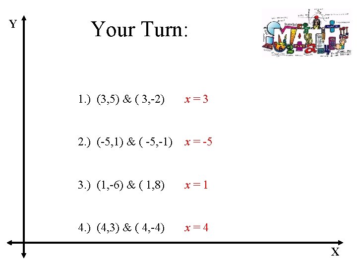 Y Your Turn: • Find the equation for the lines passing through the following points. 1. ) (3, 2) & ( 8, 2) 2. ) (-5, 4) & ( 10, 4) 3. ) (1, -2) & ( 7, -2) 4. ) (4, 3) & ( -2, 3) X