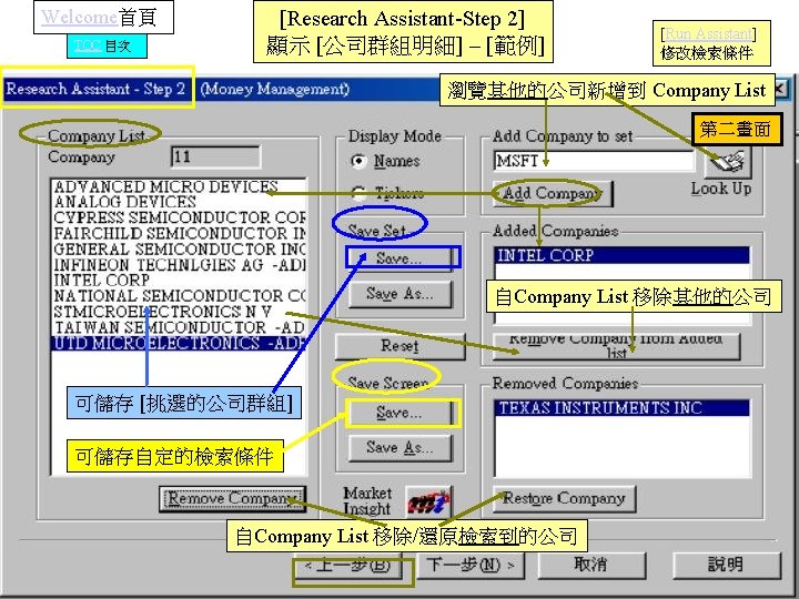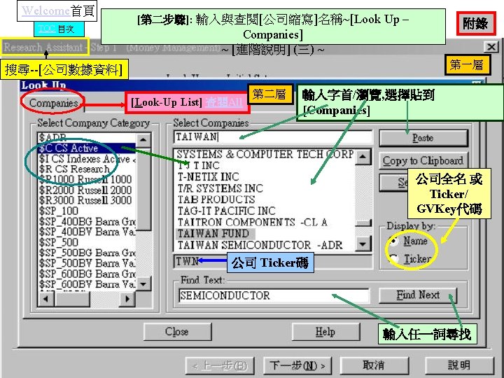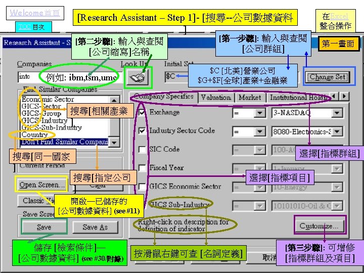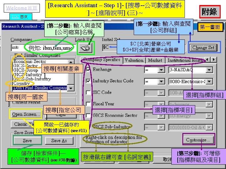 ![Welcome首頁 TOC 目次 [Research Assistant-Step 1] 搜尋 [公司數據資料] – [範例] [附錄]: [進階說明] [Run Assistant] Welcome首頁 TOC 目次 [Research Assistant-Step 1] 搜尋 [公司數據資料] – [範例] [附錄]: [進階說明] [Run Assistant]](https://slidetodoc.com/presentation_image_h2/9d15bde85ac971007aa9b716fe0dd2f9/image-10.jpg)