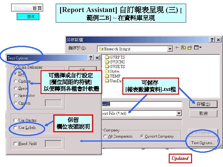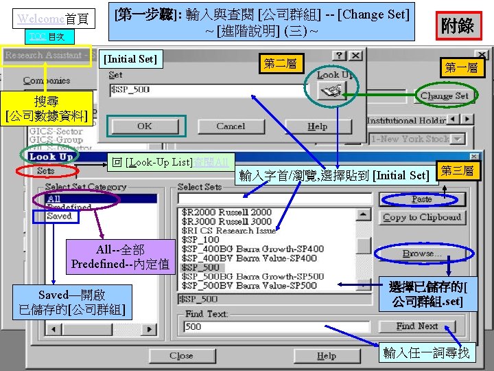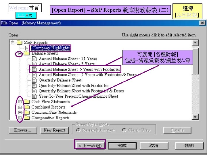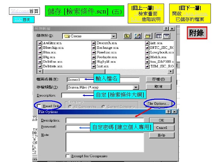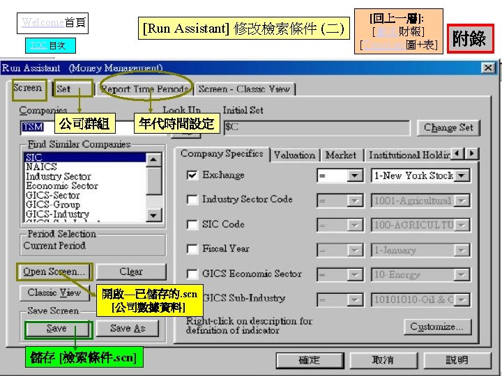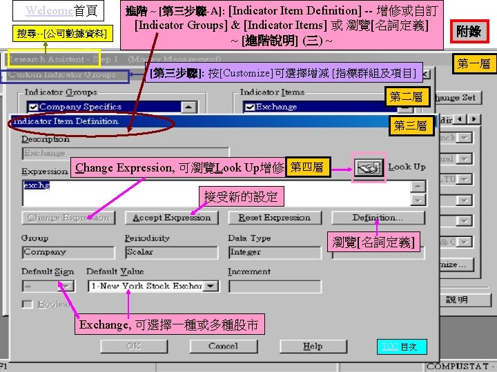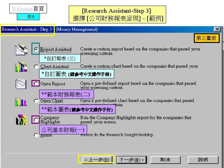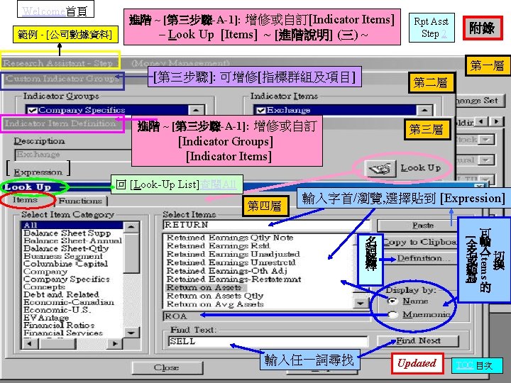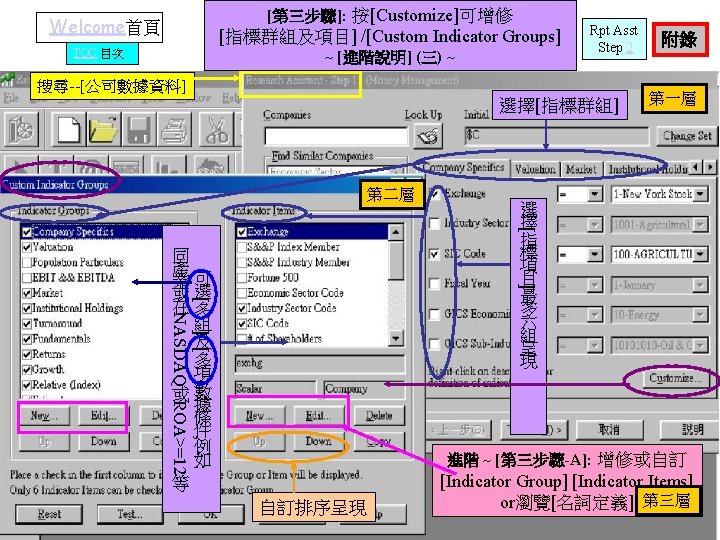 Welcome首頁 Report Assistant – Step-3 自訂報表 (四) Ex: -1 Y至 01 (當年+回朔一年) Ex: Y 96至Y 97 (會計年度/Jul 96至Jun 97) Ex: C 96至C 97 (Jan 1996 -Dec 1997) TOC 目次 附錄