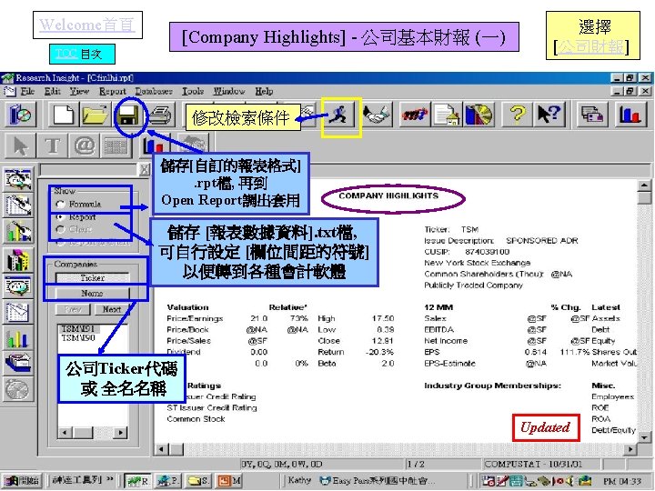Standard & Poor’s Compustat Research Insight-RI 財務數據分析軟體 首頁說明 ~ [附錄] — • • {第一種}: 在 MS Excel整合操作 [參考]: [Look Up List] 1. • • {第二種}: RI Welcome 首頁 Database: 選NA/GV資料庫 搜尋--公司數據資料 ~ • [Research Assistant] [範例] 選擇--財務報表 Report ~ 1. 2. 3. 4. 5. Company Highlight公司基本財報 Open Report 範本財報[範例] Report Assistant [自訂報表] Open Templates報表+圖表~xls 如何利用公式在 Excel 建立報表 2. 3. 4. 5. 6. 7. 如何將 Research Insight 匯入及 呈現在MS Excel 的 具列 [Run Assistant]修改檢索條件 搜尋--公司數據資料~[進階說明] [Research Assistant] Time Period 時間的設定 Save – [儲存檢索條件. scn] Save --[公司群組資料. set] 幣值轉換Currency & 匯率Rate Help /--- login • • • Reference Table ~ SIC Code… Research Insight Help Topics FAQs & Data Definitions