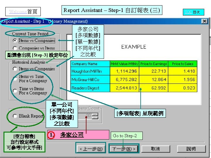 Welcome首頁 Report Assistant – Step-3 自訂報表 (三) [範例一] 1. 2. 3. Ex: -1 Y至 01 (當年+回朔一年) Ex: Y 96至Y 97 (會計年度/Jul 96至Jun 97) Ex: C 96至C 97 (Jan 1996 -Dec 1997) TOC 目次 多家公司 三項數據 (items) 當年度