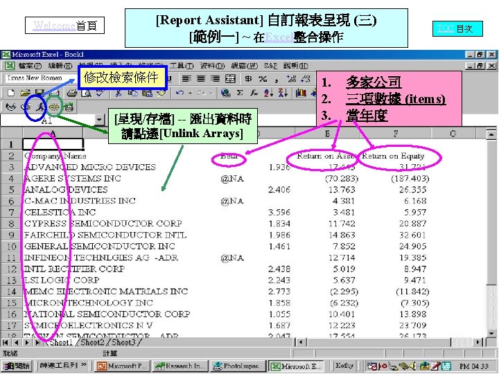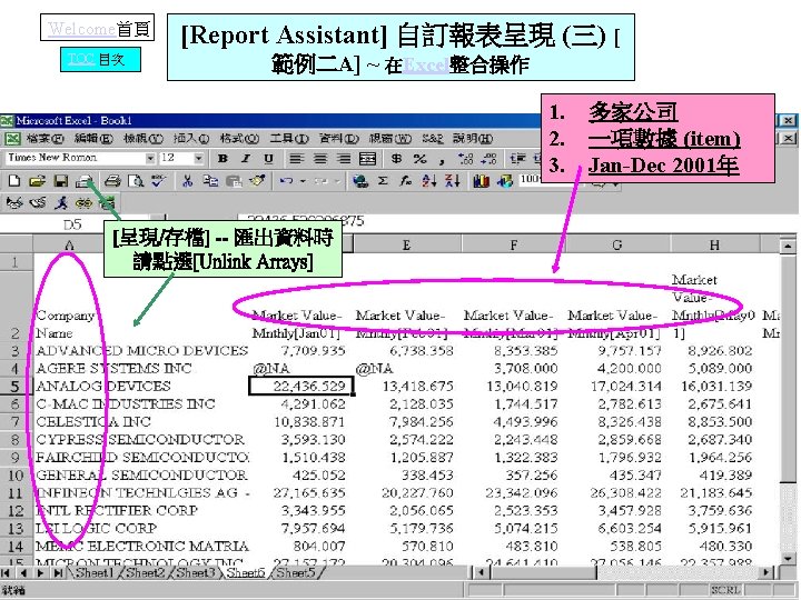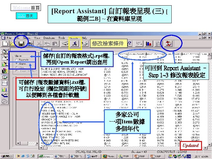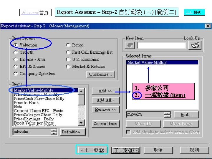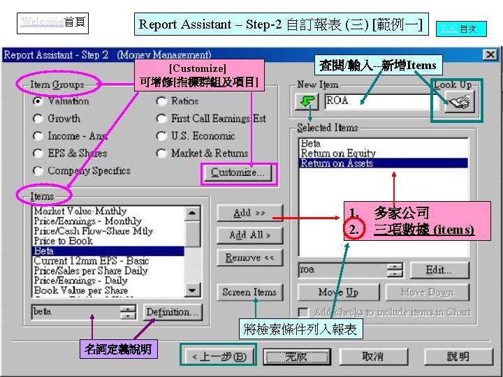 Welcome首頁 Report Assistant – Step-3 自訂報表 (三) [範例二] Ex: Y 96至Y 97 (會計年度/Jul 96至Jun 97) 1. 2. 3. TOC 目次 多家公司 一項數據 (item) Jan-Dec 2001年