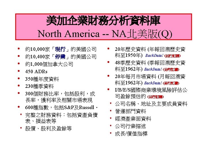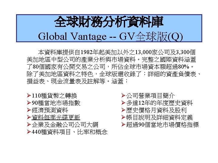 Standard & Poor’s Compustat Research Insight 財務數據分析軟體 North America -- NA北美版(Q) NA Backdata -- NA 回溯版 Global Vantage -- GV全球版(Q) www. compustat. com www. tbmc. com. tw 漢珍數位圖書股份有限公司 5 -2003 Updated