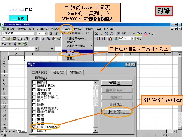 Welcome首頁 TOC 目次 如何將Research Insight 匯入 MS Excel 試算表 (一) 附錄 Win 2000 or XP應會自動匯入 具(T) 增益集 [檔案路徑] – C: Program Files/Research Insight/Excel/Spri 80