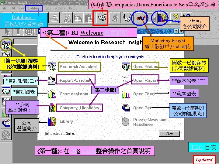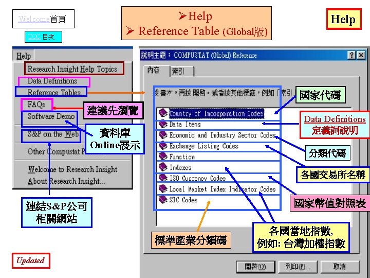 Welcome首頁 TOC 目次 ØHelp ØResearch Insight Help Topics Help 輸入data code, 可查@na or @…的說明 Updated