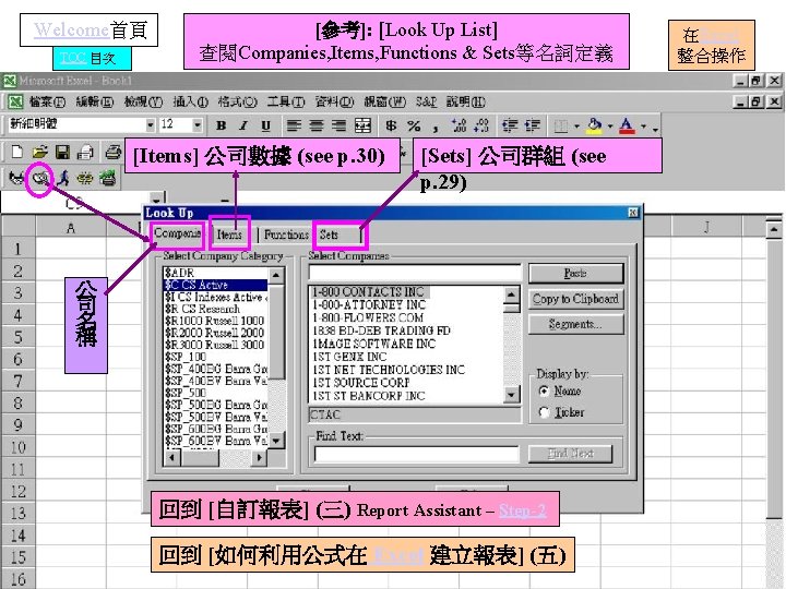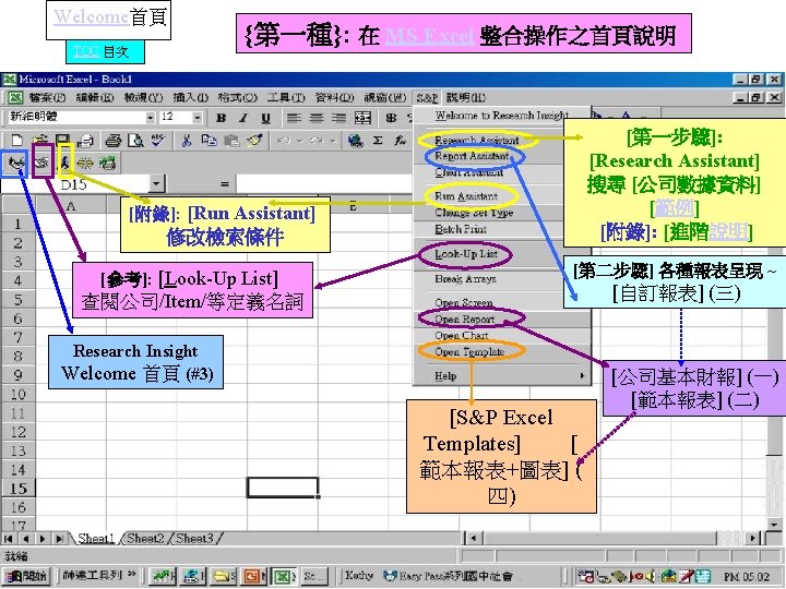 Welcome首頁 TOC 目次 [Open Templates] – [S&P Excel Templates] 報表+圖表 (四) 在Excel 整合操作 選擇公司 [Run Assistant] 修改檢索條件