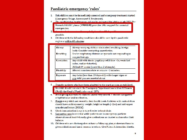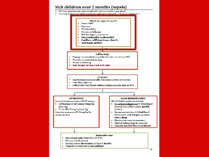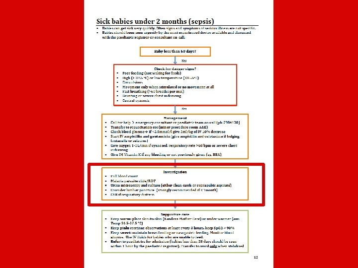 • 9 months of consultation: – Department of Paediatrics, NRH – Department of Emergency, NRH – Centre for International Child Health, Melbourne • In line with current evidence base: – WHO Pocket book recommendations – NRH Antibiotic Guidelines – New Standard Treatment Manual – RCH Melbourne guidelines – International Sepsis Recommendations