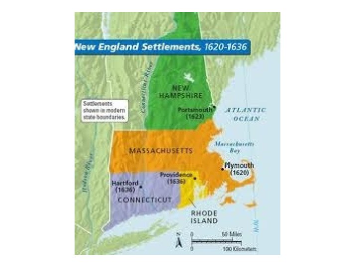 New England Colonies 1620 s • Puritan – reform the Church of England – Eliminate Catholic traces • Separatists – Pilgrims fled for religious freedom – Formed the Plymouth Colony *Wanted religious freedom for themselves, but not for other religious groups* 1630 • Massachusetts Bay Colony – Mass. Bay Company Charter • John Winthrop – 1 st governor • Create a new “model” society *There was very little religious tolerance here*