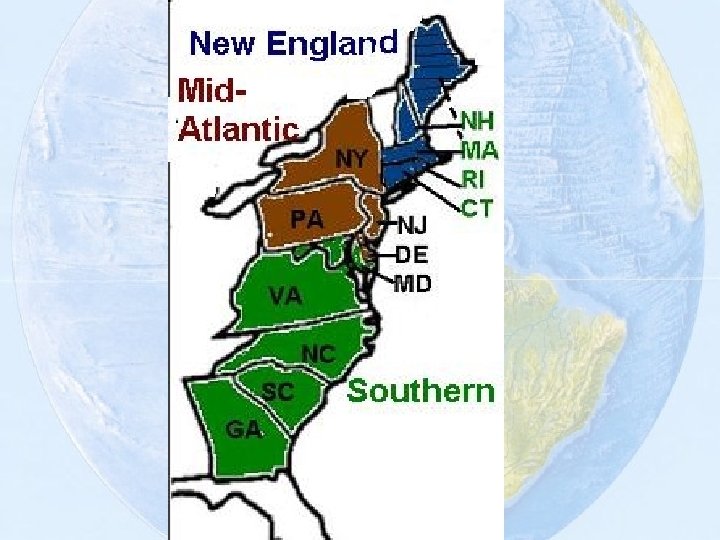 1. 1 The English Colonies were divided into three geographical regions. New England Colonies Massachusetts New Hampshire Rhode Island Connecticut Middle Colonies New York New Jersey Pennsylvania Delaware Southern Colonies Maryland Virginia North Carolina South Carolina Georgia