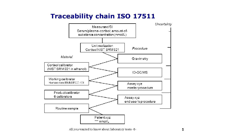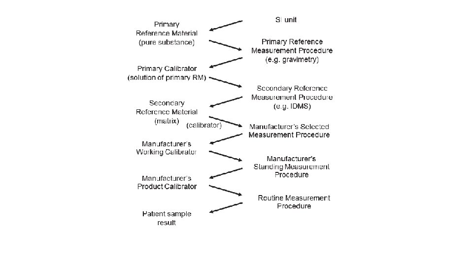Metrological traceability • True value is not known unless it is attached to a reference so that value can be assigned • is defined as “the property of a measurement result whereby the result can be related to a reference through a documented unbroken chain of calibrations, each contributing to the measurement uncertainty”. • Traceability is established to SI using a reference calibrator and reference measurement procedure