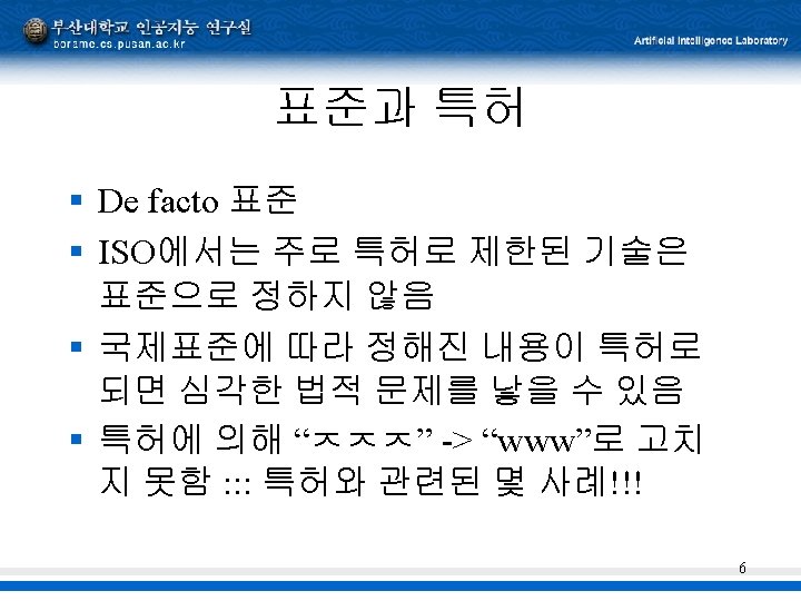 Creation of standards § Standards in the US are voluntary: § § There is no federal standards-making organization. NIST - National Institute for Standards and Technology develops standards that are only required on federal agencies, not for commercial organizations. § But: Consensus is the key to standards making: § § § Contentious features often omitted to gain consensus Only vendors have a vested interest in the results Users don't care until standard approved, and then it is too late! 한국 : : : 표준연구소, 산업자원부, 정보통신부, 과학기술처 § 4