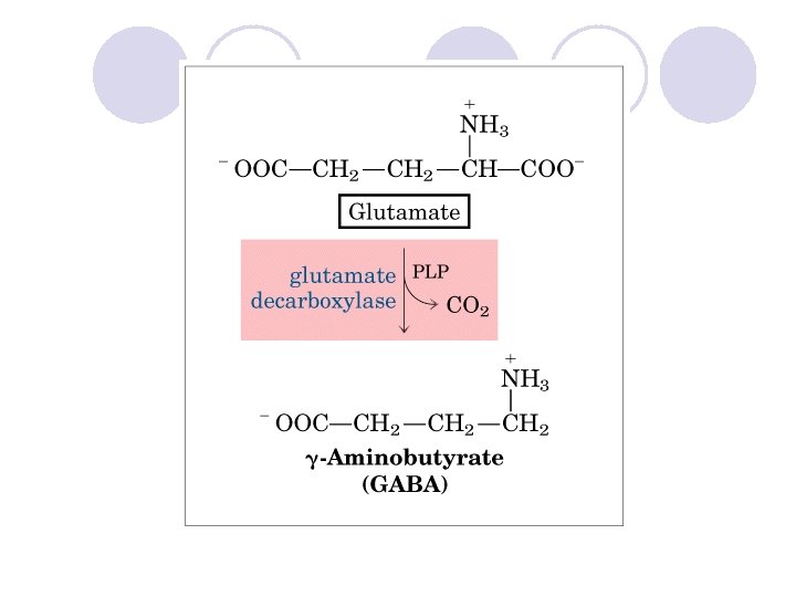 -aminobutirik asit (GABA) l Glutamino asidinin amino grubuna komşu olan karboksil grubunun dekarboksilasyonu ile inhibitör nöronlar için transmitter bir madde olan -aminobutirik asit (GABA) oluşur. GABA, önemli bir inhibitör nörotransmitterdir. Santral ve periferal sinirsel fonksiyonlarda düzenleyici rol oynar
