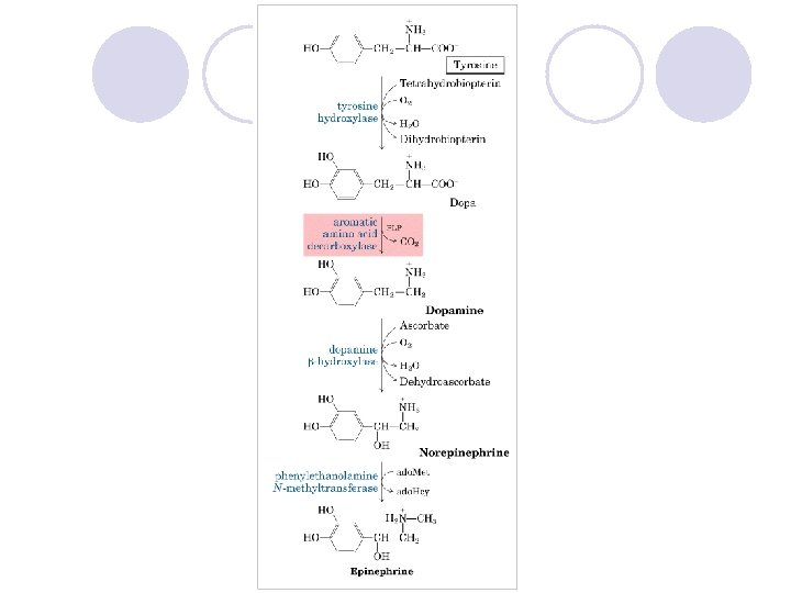 3 -4 -Dihidroksifenilalanin (DOPA) Tirozin aminoasidinden sentezlenir ve dopaminin öncülüdür. Dopa vücutta ve beyinde dopamine çevrilir. Dopamin, beyin sapının üst kısımlarında nörotransmitter olarak görev yapar. Dopaminden türeyen adrenalin (epinefrin), noradrenalin (norepinefrin) ve bunların sentezinde ara ürün olan dopamin, katekolaminler olarak bilinirler. Adrenalin ve noradrenalin, böbreküstü bezinin medülla kısmının hormonlarıdır