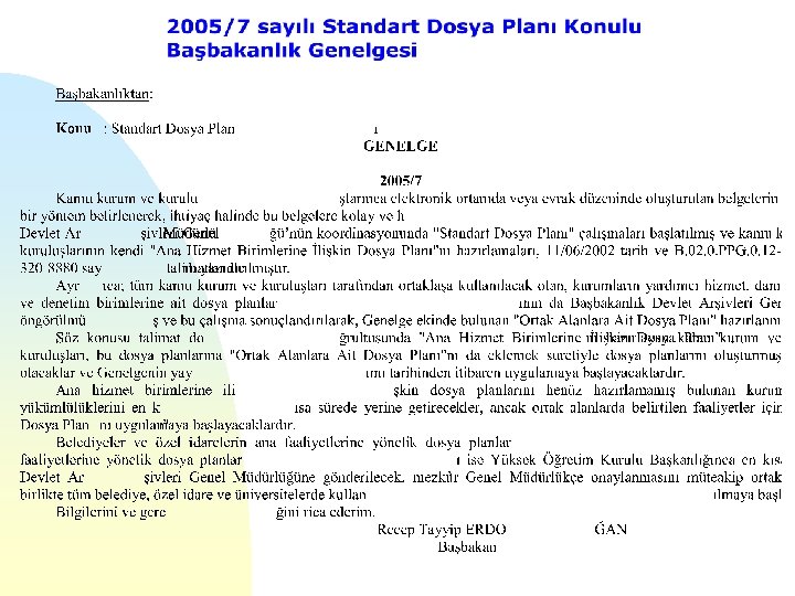 STANDART DOSYA PLANININ UYGULANMASI n n Anahizmet birimlerinin numaralandırıldığı 100 -599 sayısal aralığında ise, dosya planından sorumlu birim haberdar edilerek, bu birimlerce, -Yardımcı hizmet, danışma ve denetim birimlerinin numaralandırıldığı 000 -099 ile 600 -999 sayısal aralığında ise, kurum veya kuruluşların dosya planlarından sorumlu birimlerin Devlet Arşivleri Genel Müdürlüğü’nü haberdar etmesi üzerine bu Genel Müdürlükçe uygun görülen düzeltmeler yapılabilecektir. Dosya planları için öngörülen değişiklikler yıl sonunda yapılacaktır. Devlet Arşivleri Genel Müdürlüğü tarafından hazırlanarak, ortak kullanıma sunulan “Ortak Alanlar” (000 -099/600 -999) www. basbakanlik. gov. tr ve www. devletarsivleri. gov. tr web adreslerinde de istifadeye sunulacak olup, bu alanlarla ilgili düzeltmeler anında uygulayıcılar tarafından takip edilebilecektir.