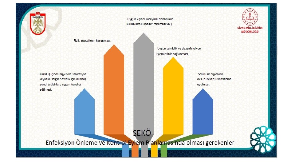 STANDART ENFEKSİYON KONTROL ÖNLEMLERİ ve BULAŞ BAZLI ÖNLEMLER • 1. Öğretmenler ders giriş ve çıkışlarında hijyeni sağlayacak gerekli tedbirleri (el yıkama vb. ) almalıdır. • 2. Dersler sırasında öğretmen ile öğrenciler arasında sağlık otoritelerince belirtilen sosyal mesafeye uygun şekilde oturma düzeni oluşturulur. Ayrıca açık havada yapılacak eğitim-öğretim faaliyetlerinde de fiziksel mesafe ve hijyen kurallarına uygun tedbirler alınır. • 3. Eğitim ortamlarında havalandırma/iklimlendirme sistemi varsa bu sistemin sadece dışarıdan temiz hava verecek şekilde ayarlanması aksi hâllerde doğal havalandırma yapılması sağlanır. • 4. Salgın dönemlerinde (COVID-19 vb. ) bulaşıcılığı engellemek için sağlık otoritelerince belirtilen kişisel koruyucu donanım (KKD) kullanılması sağlanır. • 5. Eğitim ortamlarında yüze gelmeyecek şekilde çapraz oturma düzeni sağlanır.