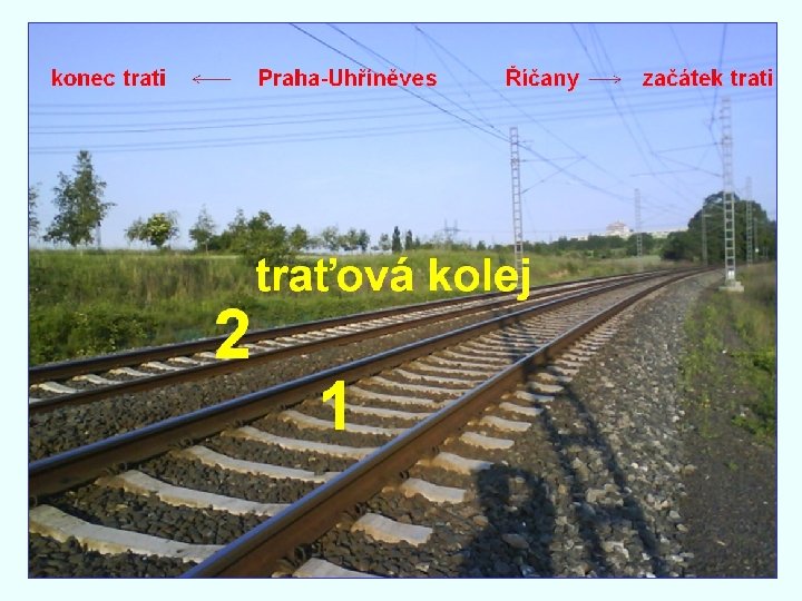 Traťová kolej • kolej na širé trati – průběžná – odvratná – manipulační • číslování – na jednokolejné trati číslo 1 • zpravidla jen pro účely výpočetní techniky – na dvojkolejné a vícekolejné trati • střední traťová kolej číslem 0 • pravá traťová kolej číslem 2 • levá traťová kolej číslem 1