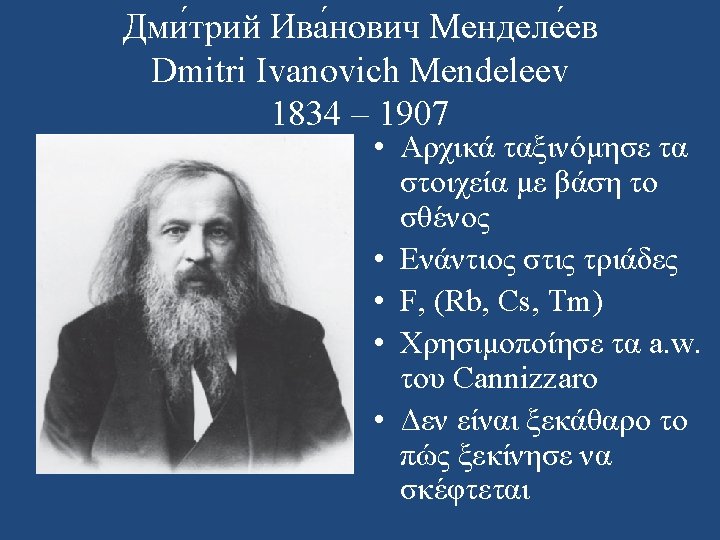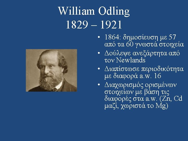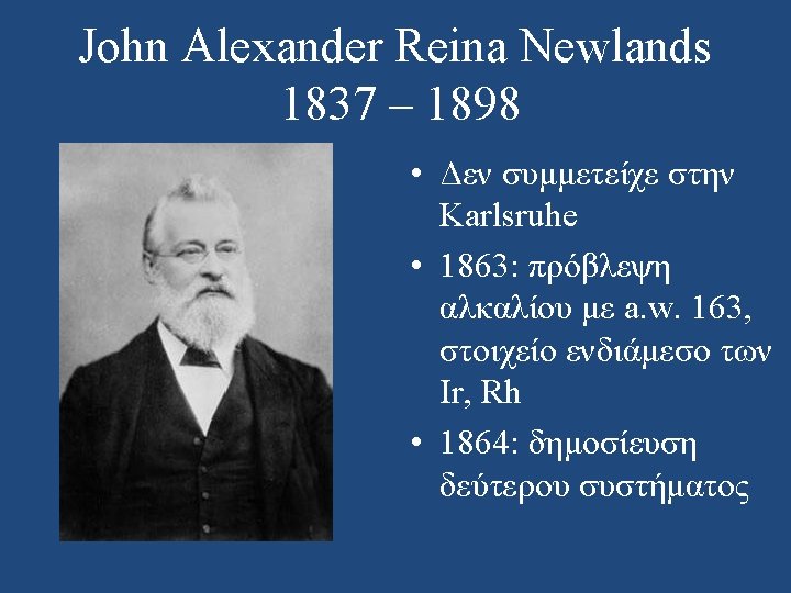 Julius Lothar Meyer 1830 – 1895 • Επηρεάστηκε από τον Cannizzaro: “The scales fell from my eyes and my doubts disappeared and were replaced by a feeling of quiet certainty. ” • 1862: στο βιβλίο του, 28 στοιχεία κατά αύξον a. w. • 1864: δημοσίευση άρθρου με 28 στοιχεία (οριζόντιες σχέσεις)
