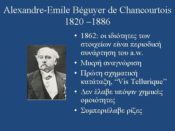Δίνοντας Faraday Lecture το 1889, ο Mendeleev σχολίασε αρνητικά αυτό το περιοδικό σύστημα. A. E. Béguyer De Chancourtois, Vis Tellurique: Classement naturel des corps simples ou radicaux, obtenu au moyen d’un système de classification hélicoïdale et numérique, Comptes Rendus de L’Academie, 54, 757– 761, 840– 843, 967– 971, 1862.