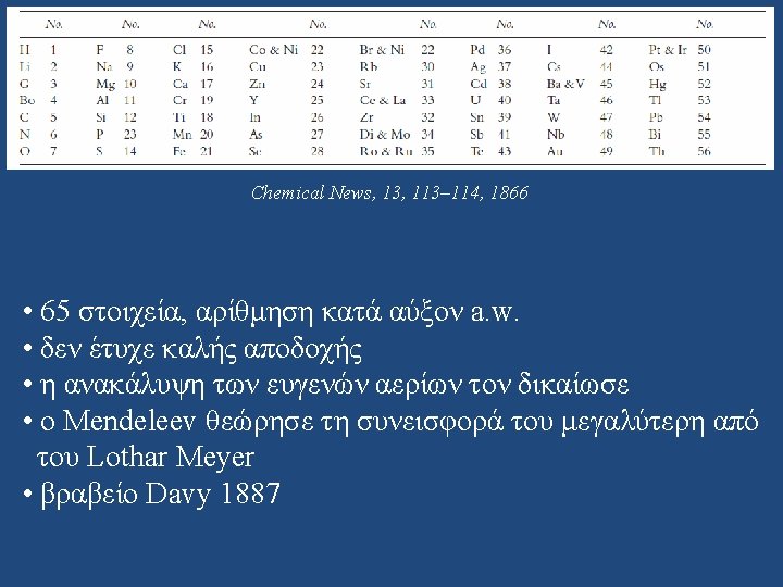 • Κατάταξη με βάση το σθένος • Χημικές και φυσικές ιδιότητες (π. χ. Te, I) • Πρόβλεψη Ge J. Lothar Meyer, Die modernen Τhoerien und ihre Bedeutung für die chemische Statisik, Breslau (Wroclaw), 1864