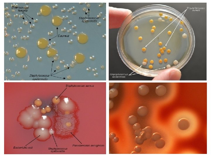 • Gram-positive cocci • Tend to create irregular stacks (grape bunches) • Asporous, nonmotile • Facultative anaerobic (fermentative) • Catalase positive • Oxidase negative • Can grow in simple environments • Optimal 30 -37 ° C (10 -42 ° C) • Form pigmented colony ü S. aureus: golden yellow ü S. epidermidis (albus): White ü S. citreus: lemon yellow