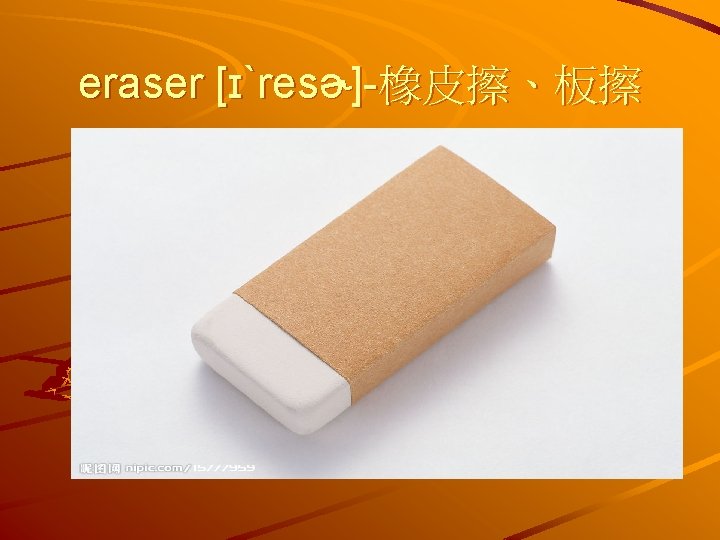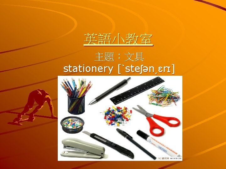 staplerstepl Staples There are many shapes of stapler Slides: 21 Download presentation stapler[ˋsteplɚ]-釘書機 Staple(s)-釘書針 There are many shapes of stapler. utility knife [juˋtɪlətɪnaɪf ]-美 刀 art knife-美 刀 blade [bled]-刀片 twin adhesive [ [twɪn ədˋhisɪv]-雙面膠 compass [ˋkʌmpəs]-圓規、指南針 Living without an aim like sailing without a compass. protractor [proˋtræktɚ]-量角器 triangle [ˋtraɪ͵æŋg!]-三角板 The plots of these stories almost always turn on love triangle. chalk [tʃɔk]-粉筆 Teachers usually write on the blackboark with chalk. calculator [ˋkælkjə͵letɚ]-計算機 He is a rapid calculator. magnet [ˋmægnɪt]-磁鐵 Earth is a big magnet. crayon [ˋkreən]-蠟筆 scissors [ˋsɪzɚz]-剪刀 nail scissors 指甲剪 paste [pest]-漿糊 He stuck the sheets of paper together with paste. pencil sharpener [ˋpɛnslˋʃɑrpnɚ]-削 鉛筆機 electric pencil sharpeners – 電動消鉛筆 機 ink [ɪŋk]-墨水 ink injection printer 墨水式印表機 He inked his pen. glue [glu]-膠水 Can you glue the broken vase together? envelope [ˋɛnvə͵lop]-信封 letter sheet – 信紙 Mother addressed the envelope. clip [klɪp]-迴紋針 paper clip correction fluid [kəˋrɛkʃənˋfluɪd]-修 正液 correction tape – 修正帶 rubber band [ˋrʌbɚ bænd]-橡皮筋