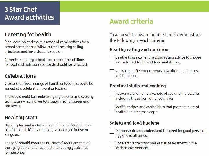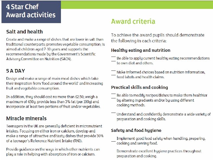 � Choose one of the three tasks to complete for homework. �Look at the criteria to pass the award. � You must provide evidence of each criteria point within your project. � Include photographs as evidence (or even a video). � To pass the award you must show your understanding of healthy eating and nutrition. You must show that you are able to use current healthy eating advice to choose a variety and balance of food and drinks. Justify your food choices with evidence. Explain that different nutrients have different sources and functions. � It must be written in your own words – DO NOT COPY AND PASTE from the internet.