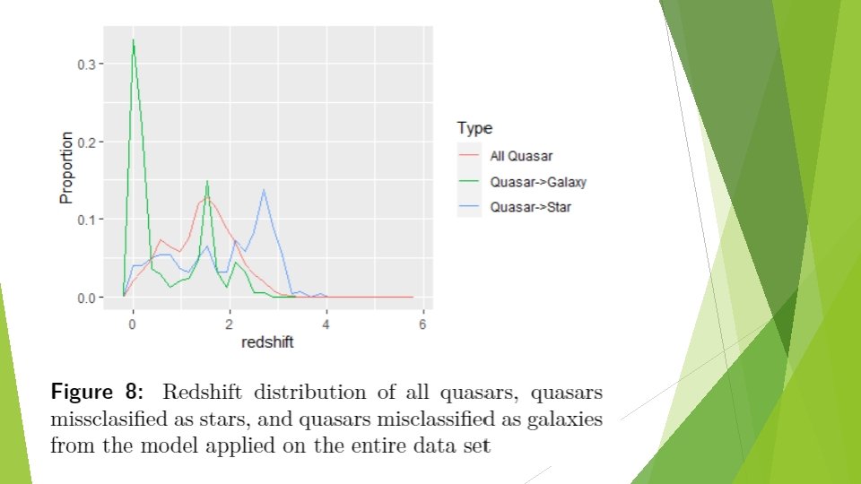 Discussion: Misclassified samples Quasar->Galaxy ► For those with low redshift values, the lights from their host galaxy can be comparable to that of the active galactic nucleus, resulting in a galaxy-like spectrum. ► We speculate that the two peaks(z around 1. 6 and 2. 2) in the redshift distribution of missclassified quasars resulted from certain spectral line being redshifted to certain wavelengths.