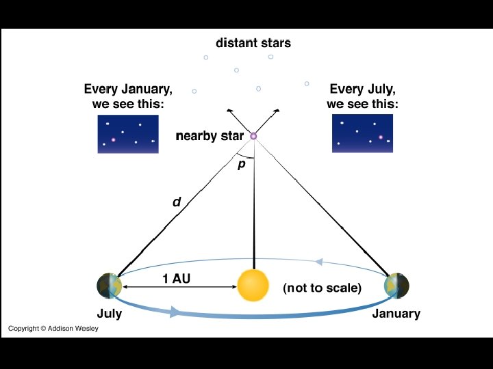 Properties of Stars - Distance • Parallax – basic way to measure distance – Stars positions appear to shift based on season – Smallest angle shift = farther away – Largest angle shift = closest