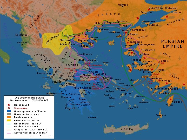 Řecko-perské války příčiny – rozpínavost Perské říše n záminka – pomoc pevninského Řecka vzbouřeným řeckým městům v Malé Asii n Průběh: r. 492 př. n. l. - první výprava (v čele p. vojsk Dáreios I. ) – prohra Řeků r. 490 př. n. l. - druhá výprava→ Athika (Sparta, Atény) - b. u Marathonu – v čele řeckých vojsk Miltiadés, běžec Peidipidos - Řekové – menší vojsko, ale lepší taktika → vítězství n