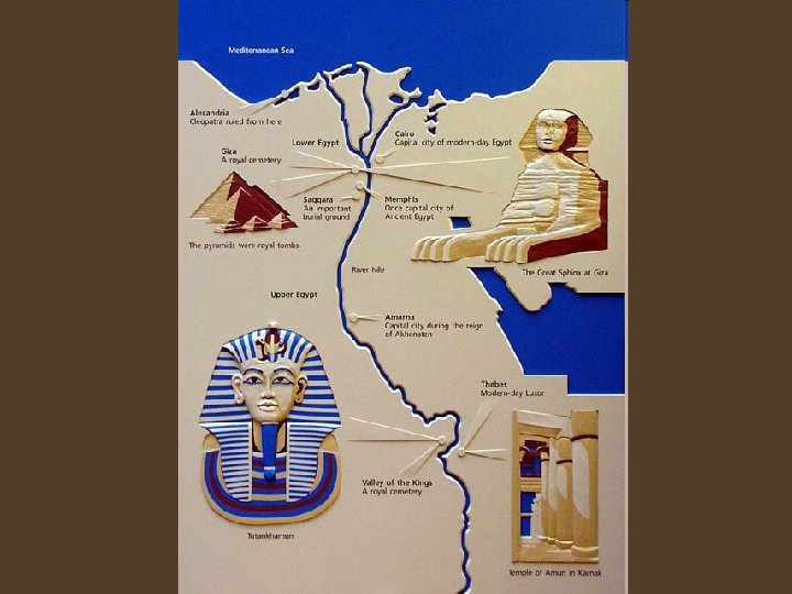 Egypt • Poloha: území 20 x 1000 km – řeka Nil • Zemědělství – pšenice, ječmen, hrách, cibule • Papyrus – plantáže v deltě Nilu - psaní, rohože, lana • Dobytek – hovězí, kozy, prasata - největší stáda chrámy 50 000 – 300 000 kusů - veterinární kontroly • Řemesla – kováři, písaři, lékaři, rybáři • Obchod – Núbie, Fénicie, Kréta. Exp: obilí, papyrus, cibule. Imp: Au, Fe, otroci