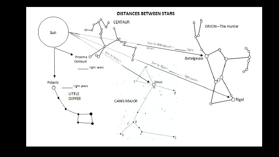 Define: Light-year at the bottom of the page. Use the internet to find the distances between 5 stars from our Sun in light-years. Color the each star to the corresponding temperature of the star.
