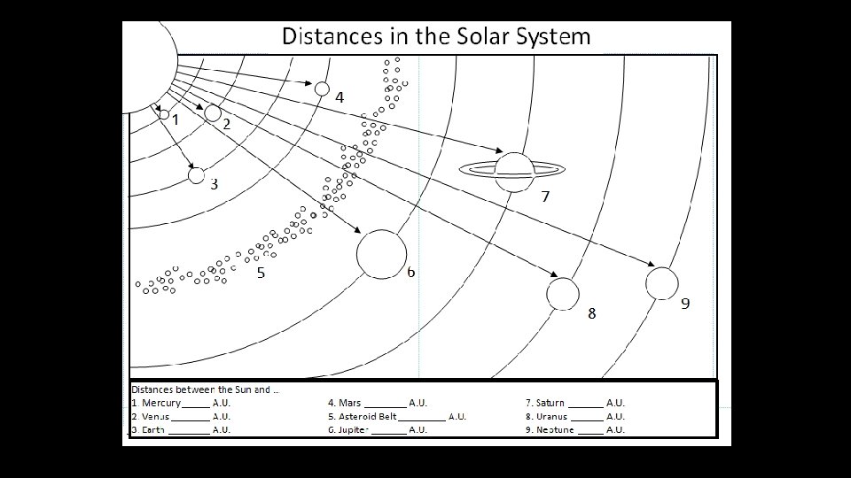 Define: Astronomical Unit at the bottom of the page. Use the internet to find the distances between planets from our Sun in Astronomical Units. Color the each planet to the corresponding appear.