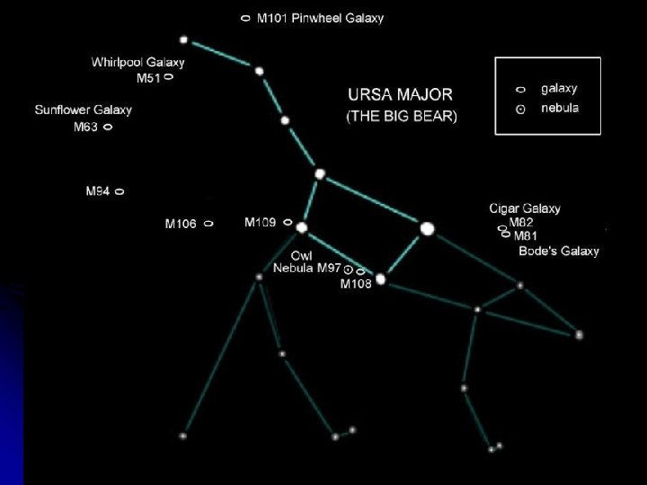 Constellations v Earth rotates on its axis, this makes most constellations appear to rise in the east and set in the west during the night. v Most constellations appear in many different positions in the sky as the Earth revolves around the sun. v There is a group of stars that appear in the sky all night long and all year long. It seems that these stars do not rise and set, but circle the Earth’s north pole each night. These stars are called circumpolar.