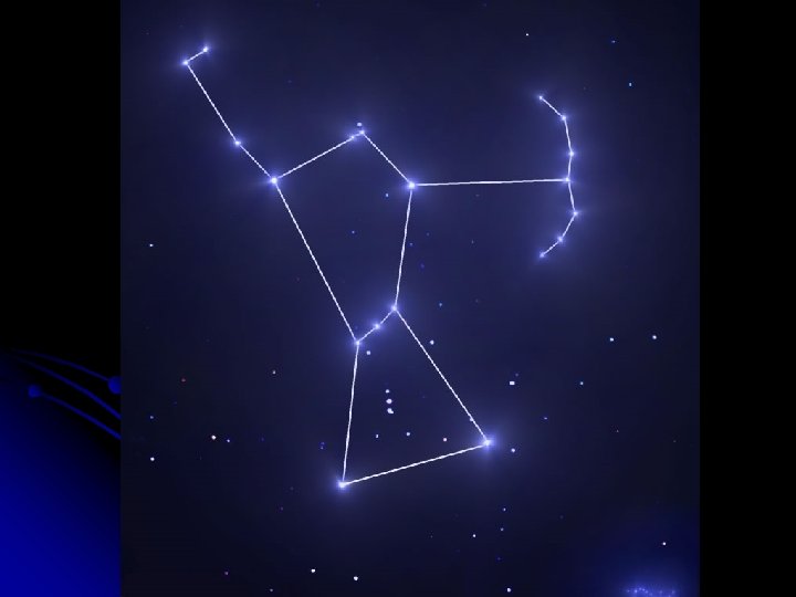 Orion- The Hunter l This Constellation was named after the Greek hunter Orion and is one of the latgest groups of stars in the sky. l Orion is in the shape of a man holding a bow and is easily recognisable by the row of three bright stars that make up is ‘belt’