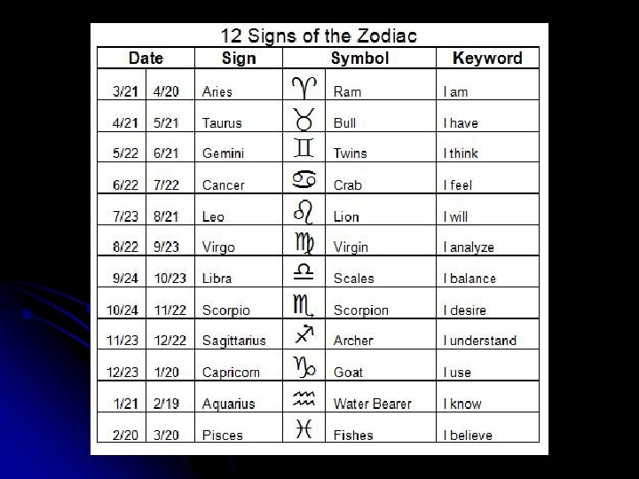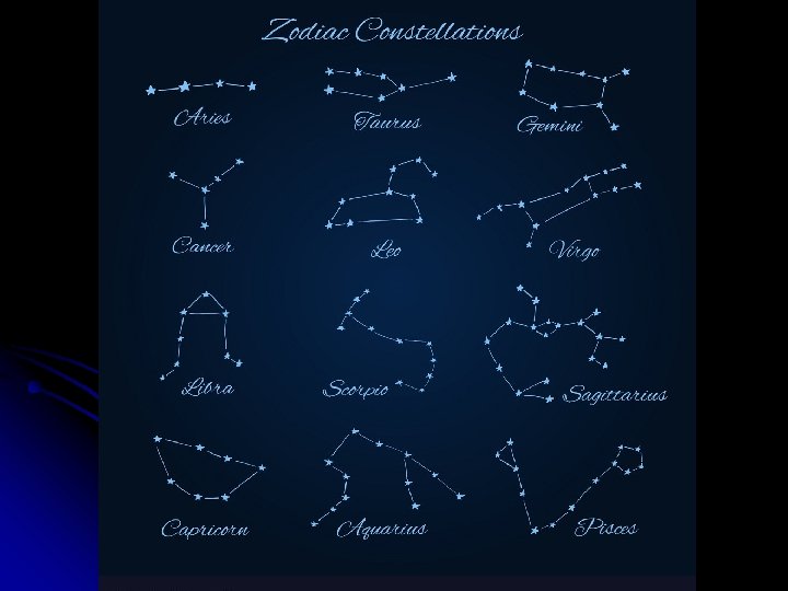 l l l l Star- large sphere of glowing gases Constellations- a pattern or group of stars in the sky Star Chart- map of the stars in the night sky used as a way to identify constellations Compass- used to locate direction in order to use a star chart correctly Telescope- used to see far away objects in space up-close An asterism, which may be part of a recognized constellation, are not constellations themselves. 12 constellation that make up the zodiac