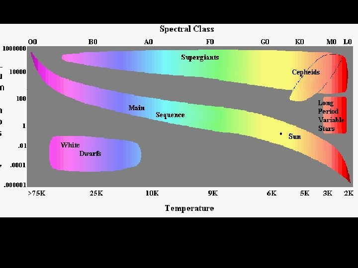 Classifying Stars • Main characteristics for stars size, temperature, and brightness. • Size – straight forward. Giant stars, or supergiant stars. – Betelgeuse – would fill up the solar system to Jupiter. • Temperatures – 3, 200 Celsius reddish color, 5, 500 Celsius white in color 10, 000 Celsius blue-white color