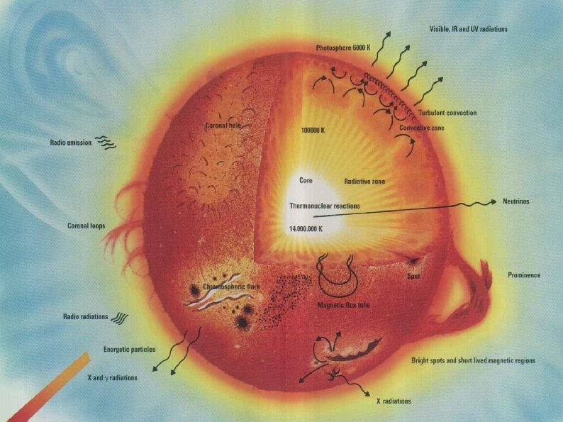 The hot plasma inside the Sun emits radiation (i. e. light) that passes through the 1. 4 million km wide solar interior. After 10 million years this reprocessed radiations passes through the Sun's outer layers – the photosphere, where it has now cooled to just 5700 K. T (Kelvin) = T (Celsius) + 273 0 K = -273 C (Absolute Zero) The light emitted by a hot plasma always has a characteristic spectrum – it's intensity (or brightness) is different at different energies (or frequencies, wavelengths, colours). Stars are almost blackbodies (i. e. they emit and absorb light equally) and so have a characteristic blackbody spectrum dependent on their surface temperature.
