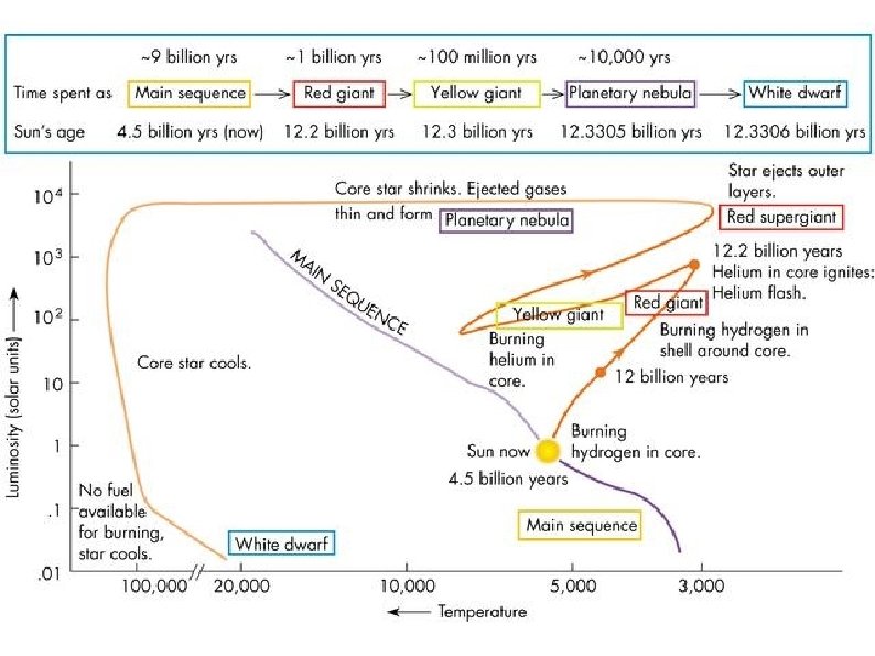 Stars spend most of their lives on the main sequence, when their hydrogen fuel runs out, the core of the star collapses, and the outer envelope expands and cools. As the core collapses it heats up and eventually becomes hot enough to ignite the fusion of helium atoms, which enables the star to maintain an equilibrium. At this stage it has grown so large that it is now a cool red giant star like Betelgeuse (Alpha Orionis).