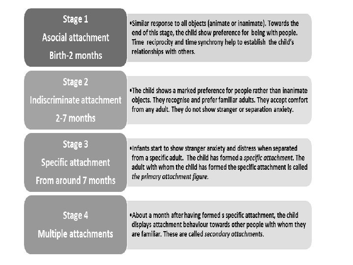 Consolidation activity Task 1: Using the lists on your handout, complete the table to indicate which behaviours are found, and who an infant has a preference for at each stage Task 2: For each of the following children, decide which stage of attachment they are at. Justify your answer (page 10 -11)