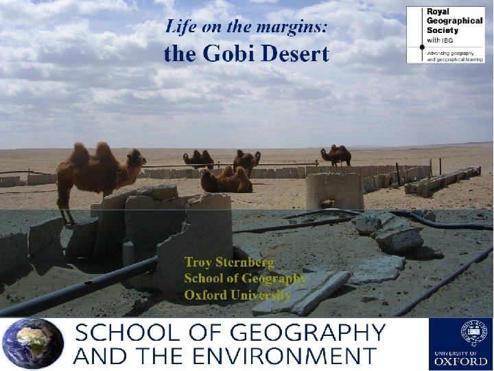 Starter: Background of the Gobi Desert – A land of extremes ØThe Gobi is a cold desert that can reach -40 degree centigrade in the winter, however can be over 40 degree centigrade in the summer. ØIt has a range of different landscapes, including white sand dunes, green pastures for herding and red sandstone formations. It is located on a plateau roughly 910– 1, 520 meters above sea level. ØAn average of approximately 194 millimetres of rain falls per year in the Gobi. Although a desert, there are some surface and underground rivers. Winter & summer conditions in the Gobi Desert: