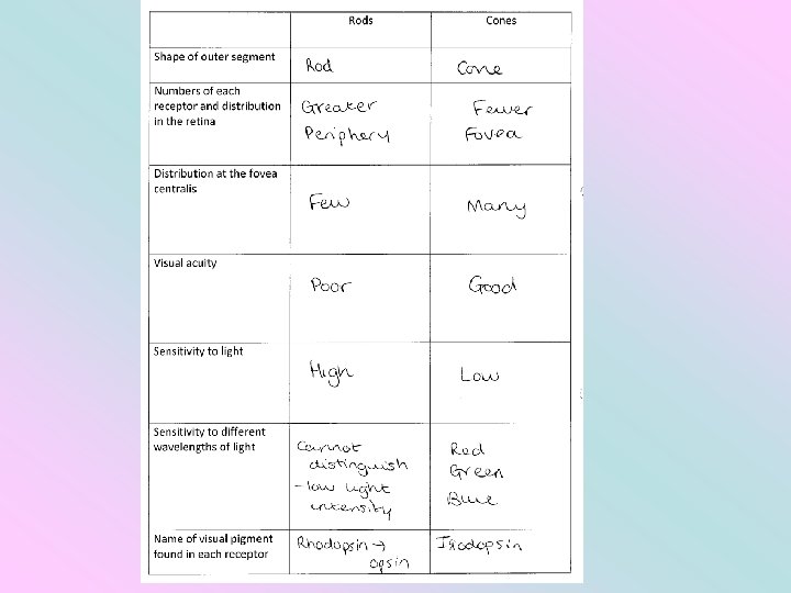 Iodopsin pigment Rod cells Cone Cells Rod-shaped Cone-shaped One type Red, green & blue types Greater Fewer numbers than cones rods Distributed more in the periphery Fewer at periphery, concentrated in fovea Poor acuity Good acuity High sensitivity Low sensitivity Rhodopsin pigment Iodopsin pigment