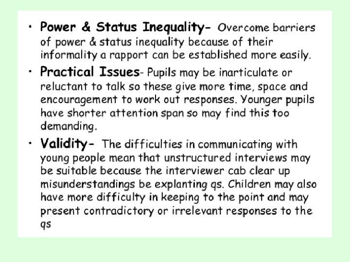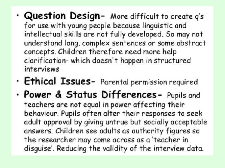 Practical issues linguistic and intellectual skills of the pupils • Can lead to misunderstandings and incorrect or incomplete answers – leading to problems with validity of the data • Unstructured interviews may be more suitable than structured ones, since they allow the interviewer to clear up any misunderstandings • Unstructured interviews can cause problems though, especially with students and keeping to the point • Interview may be better though, than a questionnaire as children tend to have better verbal skills