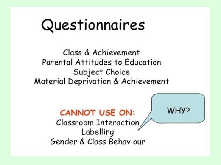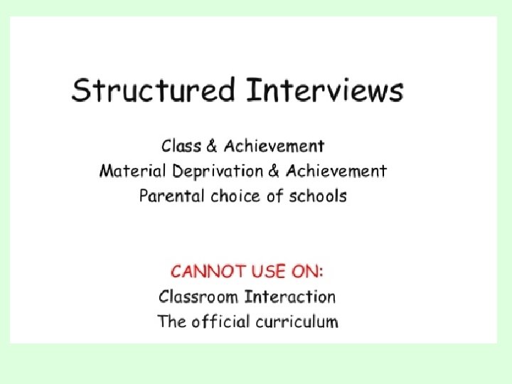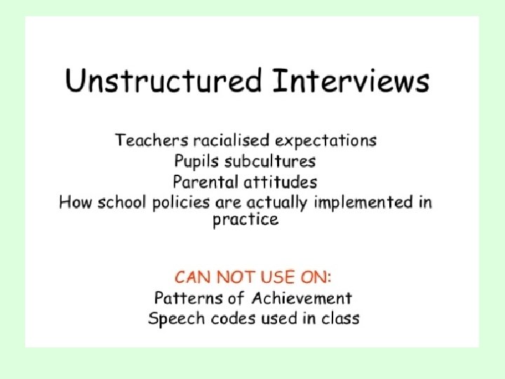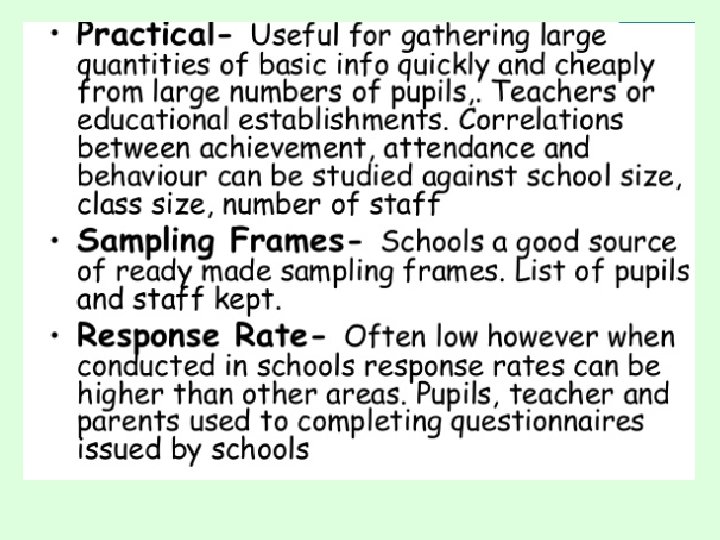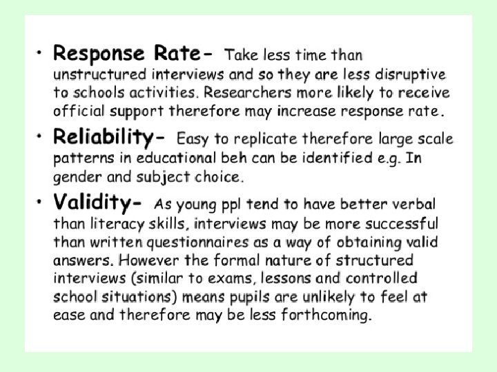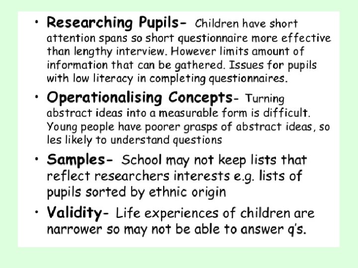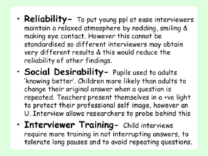 Access and response rate… • Problems with gaining permission (students = parents) (teachers = head teacher) • Schools may be reluctant to allow sociologists to conduct interviews during lesson time due to disruption or the topic chosen • Problems conducting interviews after school hours either at home or school • Problems gaining parental permission e. g sensitive topics - field’s (1987) study of pupils experience of sex and health education in schools had a high refusal rate of 29% due to parental consent