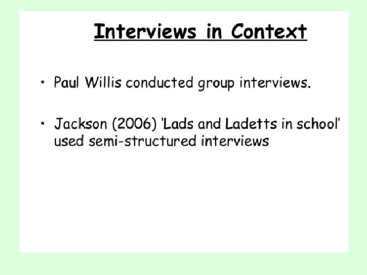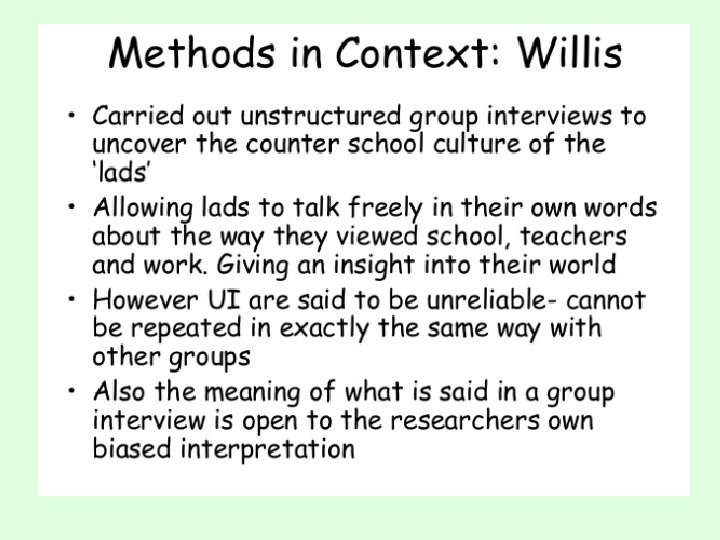 Group interviews L Young people are strongly influenced by peer pressure reducing the validity of the data gathered L E. g very difficult to interview peer groups in a group! L Impossible to standardise, reducing reliability J Safe peer environment and reproduce the small group settings that young people are familiar with in classrooms J Peer support reduces the imbalance between adult interviewer and young interviewee found in 1 -2 -1 interviews J Can reveal interactions between pupils