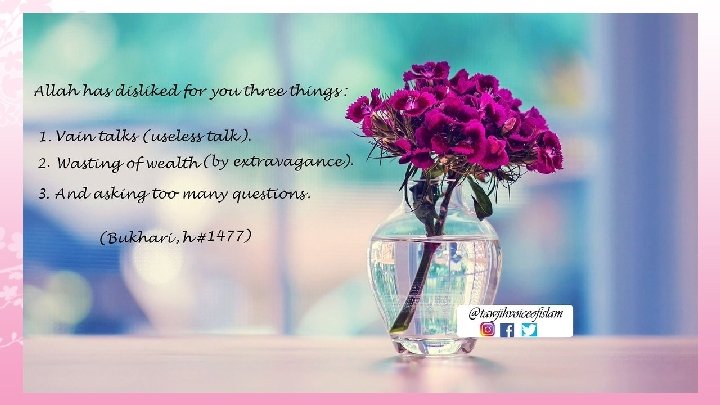 Noble Hadeeth • The prophet (PBUH) said: “Eat, drink, wear clothes and give charity without any extravagance or vanity. ” Read and reflect on it