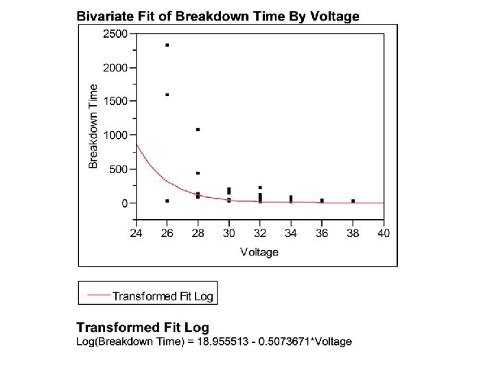 Interpreting Coefficients When Y is Logged But Not X • Example: In an industrial laboratory, under uniform conditions, batches of electrical insulating fluid were subject to constant voltages until the insulating property of the fluids broke down. • Goal: Estimate E(Y|X), where Y=Breakdown Time, X=Voltage Level • The log Y transformation works well for this data: