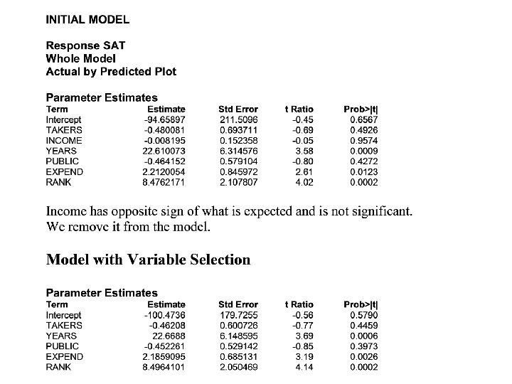 SAT Data • Y = Average score on 1982 SAT for the state. • Explanatory Variables: – X 1=Takers (% of Total Eligible Students in the state who took the exam). – X 2=Income (Median Income of Families of Test Takers) – X 3=Years (Average Number of Years That Test Takers Had Formal Studies in Social Sciences, Natural Sciences and Humanities) – X 4=Public (Percentage of Test Takers who attend public schools) – X 5=Expend (Total State Expenditure on Secondary Schools, expressed in hundreds of dollars per student) – X 6=Rank (Median percentile ranking of test takers within their secondary classes)