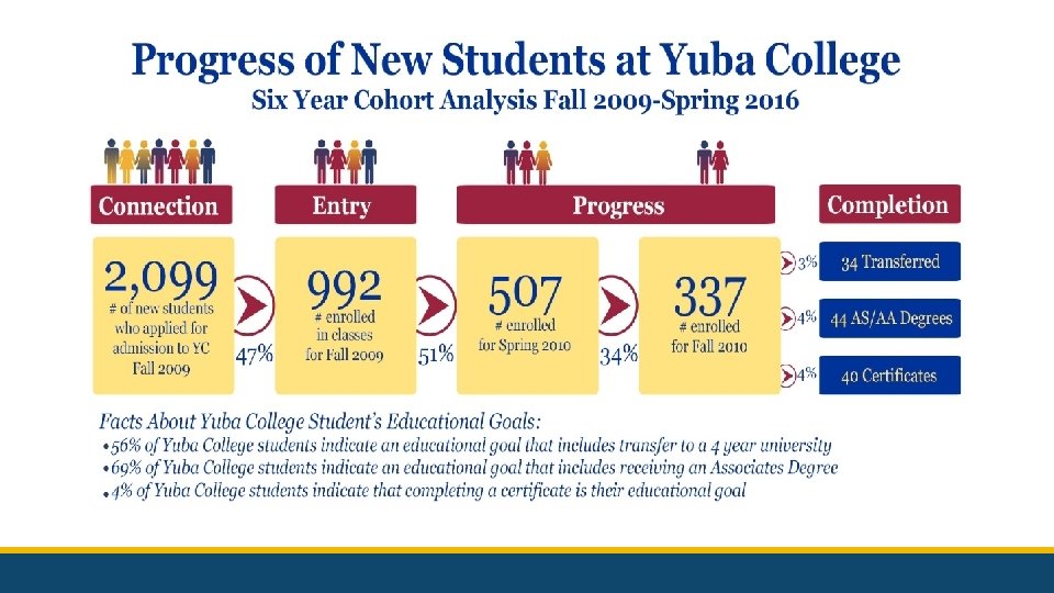 Environmental Scan Highlights FOCUS ON TRANSFER: Increasingly, Yuba College students are citing transfer as an educational goal. In 2015 -2016 59. 6% of Yuba College students selected transfer as an educational goal, up from 51. 7% in 2011 -2012. STUDENT SUCCESS: Yuba College generally is below state averages on a variety of student success measures. ACADEMIC STAFFING: Twenty-eight percent decline in the number of Yuba College fulltime faculty from 2008 -2009 to 2015 -2016. With this decline there has been an increasing reliance on part-time faculty to maintain and staff programs.