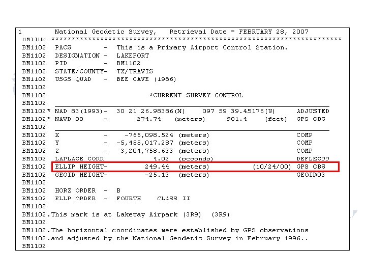 Reduction of distances D h=H+N h H N R=Earth Radius 6, 372, 161 m 20, 906, 000 ft. S S = D x ___R__ R+h S=Dx Earth Center ___R___ R+H+N