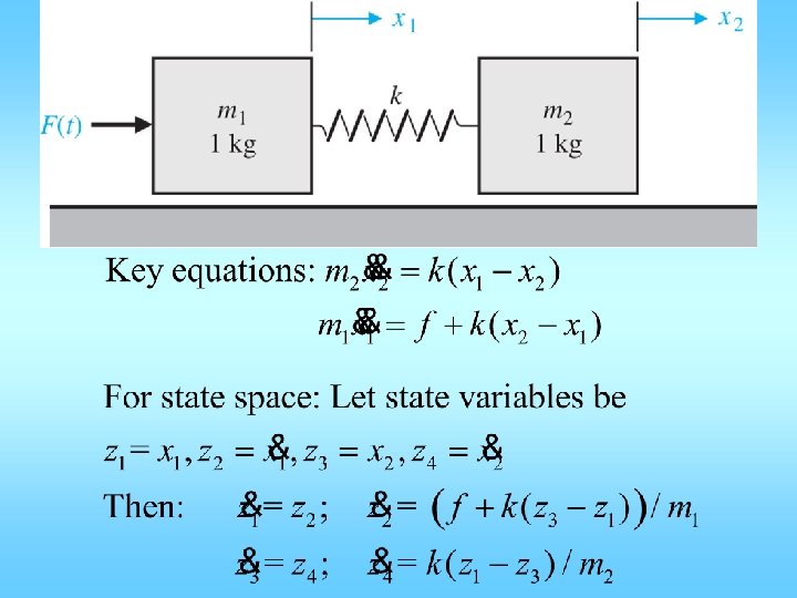State Space Model • For linear motion – Define two state variables for each mass – x 1=position, x 2 = velocity; x 1 -dot = x 2 – x 2 -dot is acc and solve for it from Newton’s • For angular motion – Define two state variables for each rotating inertia – x 1= angle, x 2 = angular velocity; x 1 -dot = x 2 – x 2 -dot is angular acc and solve for it from Euler’s law